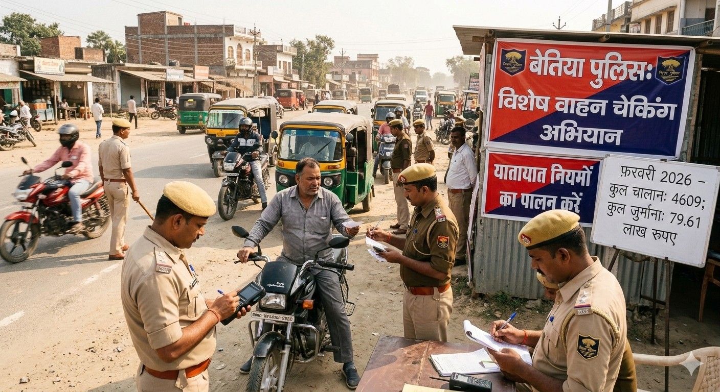 पश्चिम चंपारण जिले में यातायात नियमों के उल्लंघन को लेकर बेतिया पुलिस ने फरवरी 2026 के दौरान सख्त कार्रवाई की। वाहन जांच अभियान के तहत कुल 4609 वाहनों का चालान किया गया, जिससे 79 लाख 61 हजार 500 रुपये की शमन राशि वसूल की गई।