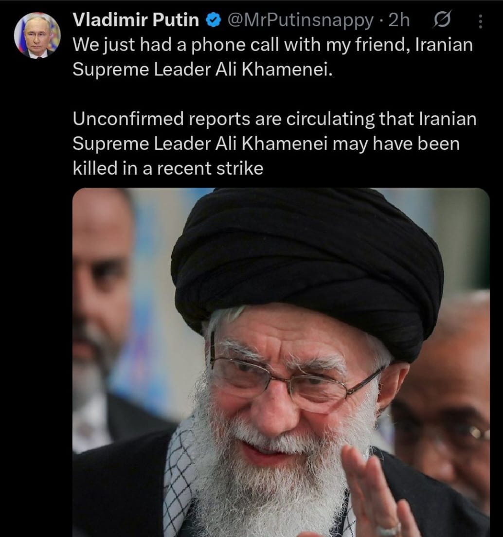 रूस के राष्ट्रपति Vladimir Putin के नाम से सोशल मीडिया प्लेटफॉर्म X (पूर्व में ट्विटर) पर एक पोस्ट तेजी से वायरल हो रही है। इस पोस्ट में दावा किया गया है कि ईरान के सर्वोच्च नेता Ali Khamenei जीवित हैं और उनसे हाल ही में फोन पर बातचीत हुई है।